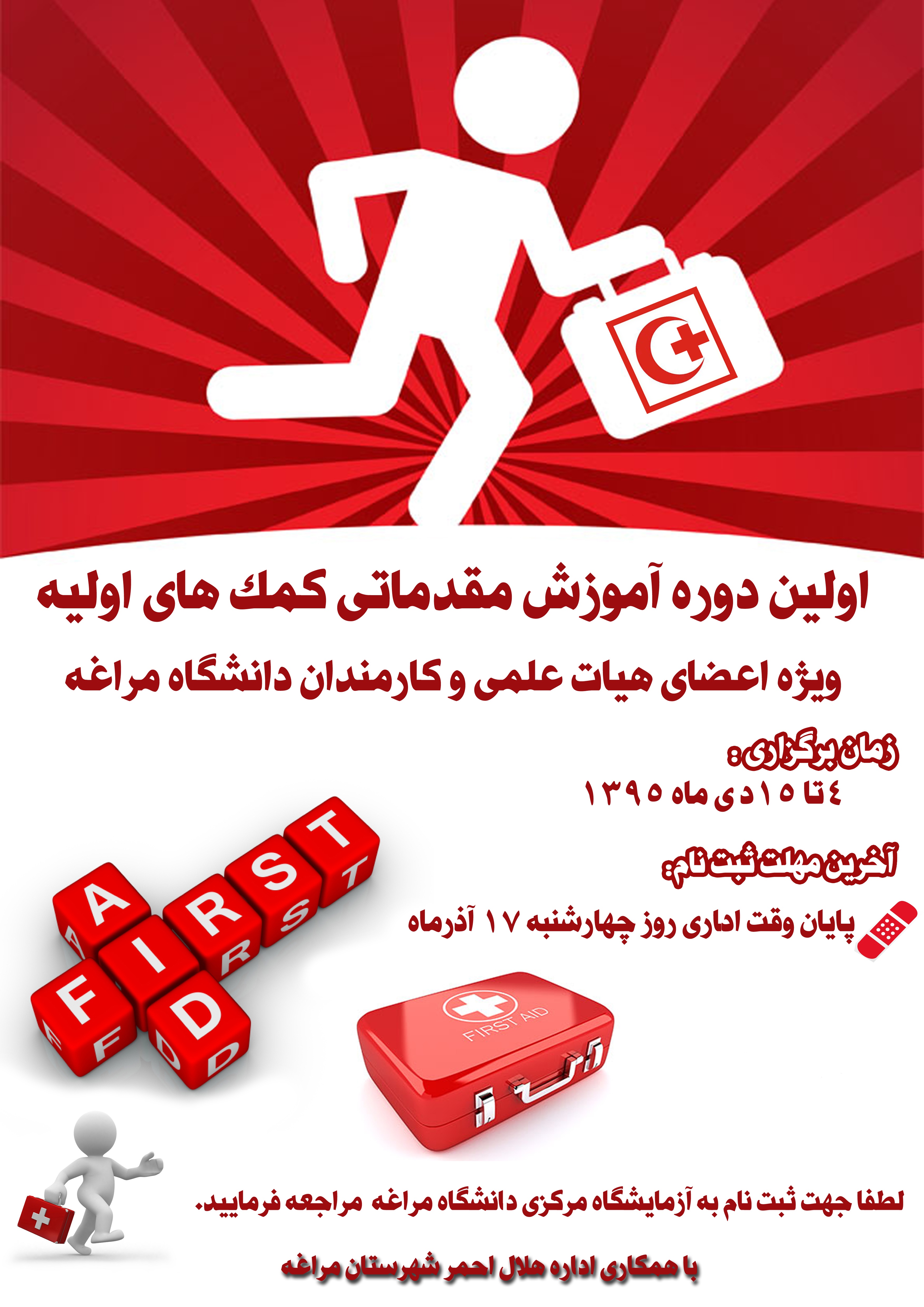 اولین دوره آموزش مقدماتی کمکهای اولیه در دانشگاه مراغه به همت آزمایشگاه مرکزی و شورای بهداشت، ایمنی و محیط زیست (HSE) و با همکاری اداره هلال احمر شهرستان مراغه و نیز مدیریت امور اداری و مدیریت برنامه بودجه دانشگاه به مدت ۱۰ روز از ۴ الی ۱۵ دی ماه ۱۳۹۵ در آمفی تئاتر فجر دانشگاه برگزار شد.